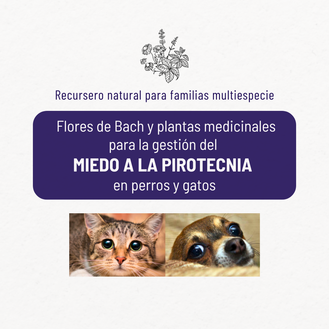 Una guía práctica de 35 páginas para que aprendas a incorporar esencias florales de Bach y plantas medicinales como alternativas inocuas y efectivas para la gestión del miedo, inquietud y ansiedad en perros y gatos ante estruendos provocados por la pirotecnia.